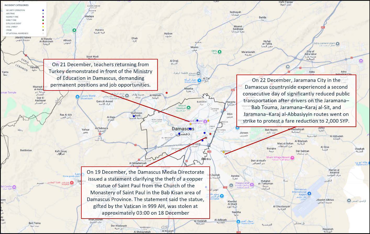 Security activity in Damascus and its surrounding countryside during the reporting period included hostile incidents, civil pressure linked to economic conditions, and a series of law enforcement and counter-narcotics operations. Along the Damascus–As Suwayda road, GoS-linked media reported that National Guard forces targeted the ISF Matouna checkpoint. No casualties were reported. Separately, an explosive ordnance disposal team member was killed when a mine detonated during a training course focused on mine removal and installation, though no further details were provided regarding the circumstances of the incident.